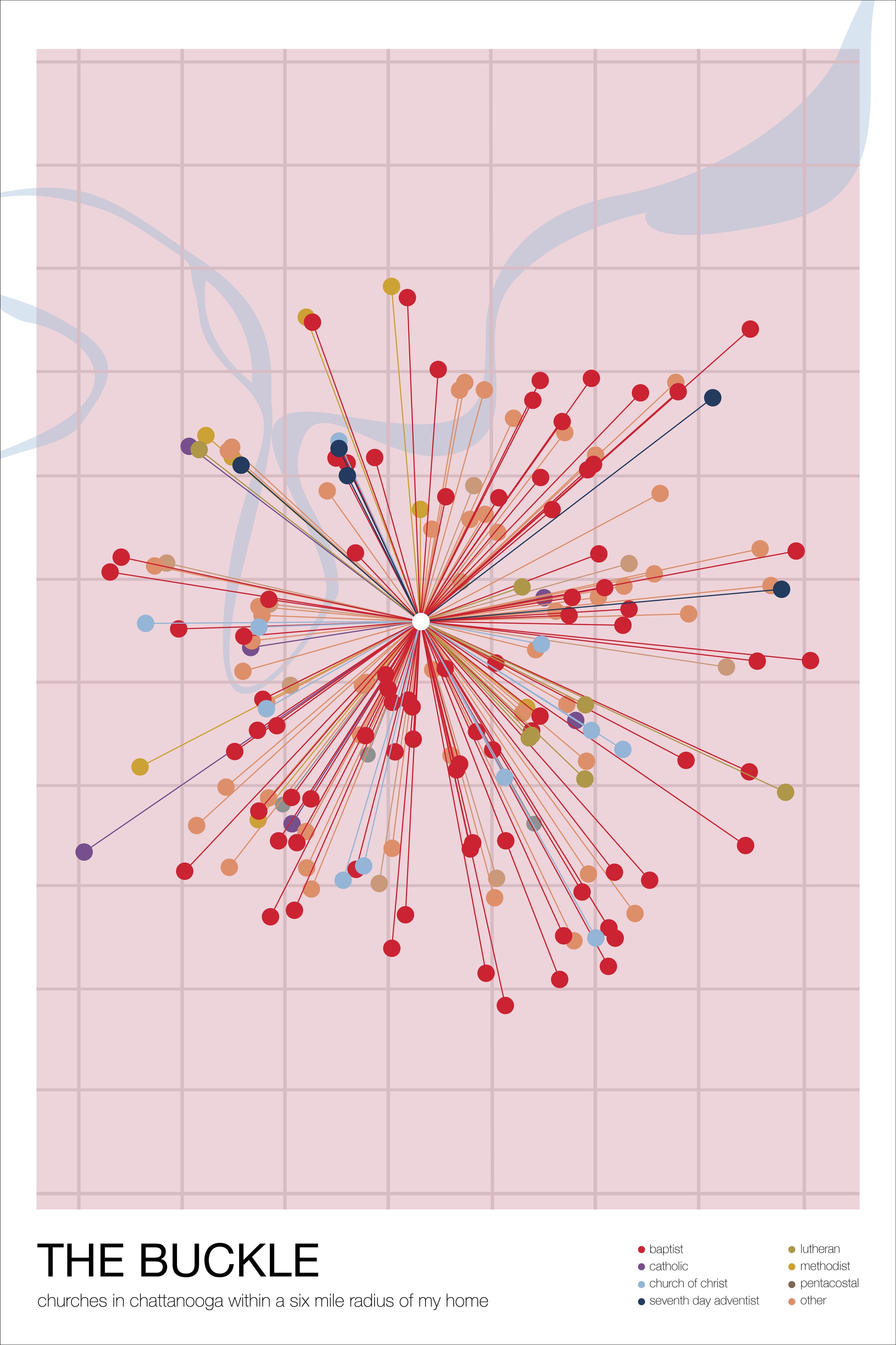 Drawing inspiration from W.E.B. Du Bois’ Data Portraits, I aimed to visually represent over 180 churches within a six-mile radius of my home in Chattanooga, known as the 'Buckle of the Bible Belt.' Growing up surrounded by this abundance of churches felt normal, yet my research revealed how deeply embedded Christianity was in my childhood experience.